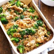 Creamy Chicken Broccoli Quinoa Casserole in Serving Dish